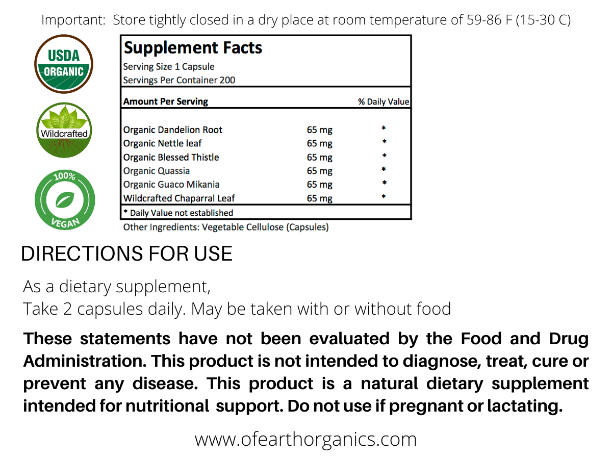 Ingredients: Organic Dandelion Root Powder, Organic Nettle Leaf Powder, Organic Blessed Thistle Powder, Organic Quassia Powder, Organic Guaco Mikania Powder, Organic Chaparral Leaf Powder