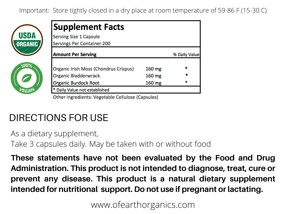 Ingredients: Organic Irish Moss Powder (Chondrus Crispus), Organic Bladderwrack Powder, Organic Burdock Root Powder