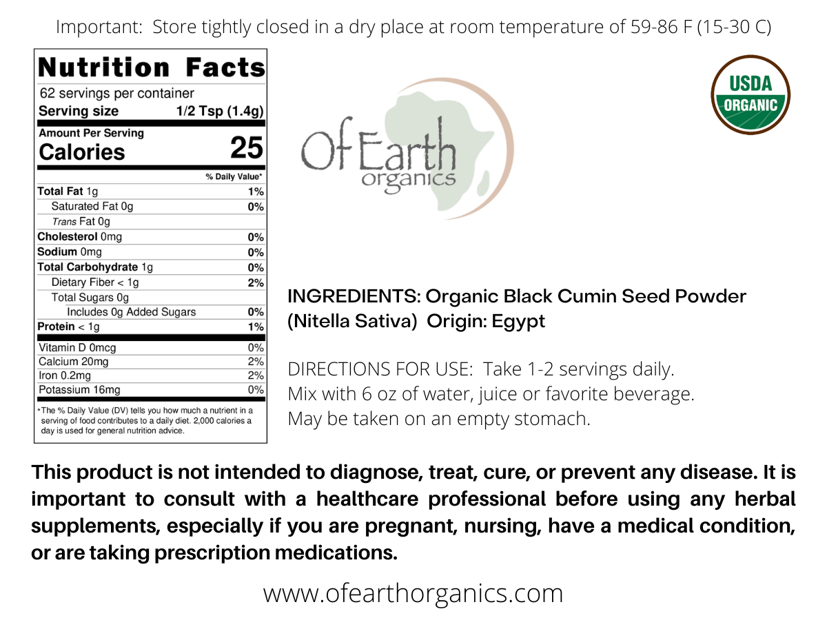 Ingredients: Organic Raw Black Cumin Seed Powder (also known as Nigella Sativa) Origin: Organically Grown in Egypt